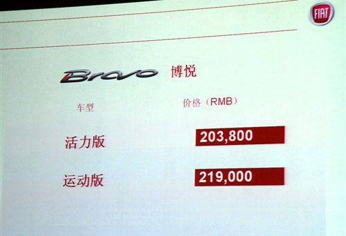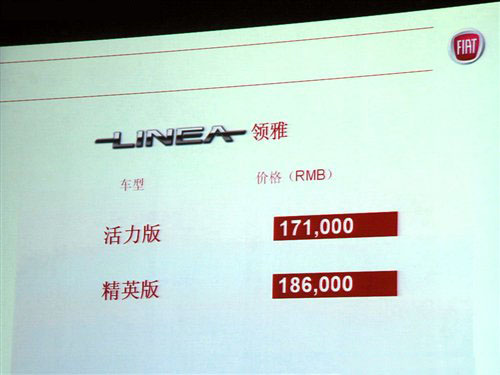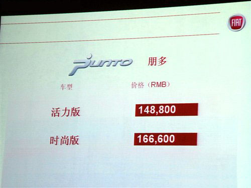 2008年8月21日,菲亞特Bravo、Linea和Grande Punto三款進(jìn)口車(chē)正式在中國(guó)上市,售價(jià)為14.88萬(wàn)~21.90萬(wàn)元,其中Bravo博悅活力版20.38萬(wàn)元/運(yùn)動(dòng)版21.90萬(wàn)元、Linea領(lǐng)雅活力版17.10萬(wàn)元/精英版18.60萬(wàn)元、Grande Punto朋多活力版14.88萬(wàn)元/時(shí)尚版16.66萬(wàn)元。