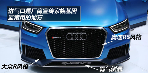 大眾R的下進(jìn)氣口,奧迪RS的主進(jìn)氣口,再加上霸氣側(cè)漏的Quattro標(biāo)志,這是除了車漆,我對(duì)RS Q3的最明顯形容。
