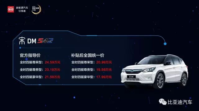 4月17日,以“電動·未來 王朝創(chuàng)造”為主題的比亞迪品牌盛典在上海舉行,宋家族兩款重磅新車——宋DM、宋EV300正式上市。其中,宋DM補貼后全國統(tǒng)一價為17.99萬元—20.99萬元,宋EV300補貼后全國統(tǒng)一價為19.99萬元—20.99萬元。比亞迪還額外給予首批1萬名用戶各1萬元的電費,能充1萬6千6百度電,行駛超過8萬公里,相當于普通新能源車5年的行駛里程。宋DM和宋EV300的上市,開啟了一種“為客戶考慮購車用車費用”的全新定價模式,讓買車容易養(yǎng)車也不難。