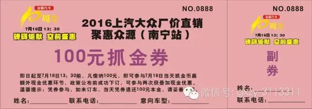 倒計時4天!凡在7月16日13:00前,報名參加活動,交100元即可獲得當天抓金贏額外現(xiàn)金優(yōu)惠資格(如當天未成功訂車,100元現(xiàn)場可退),還有萬元好禮幸運大抽獎。7月16日14:00,價格優(yōu)惠政式揭曉,敬請期待!