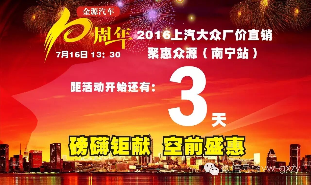 源有約.惠相迎——賀金源汽車10周年慶,2016上汽大眾廠家直銷聚惠眾源(南寧站),磅礴鉅獻 空前盛惠!廣西眾源攜手卡盟汽車團購網強勢合作,直擊上汽大眾全系優(yōu)惠盛況!7月16日與您相約興寧區(qū)松柏路11號(昆侖大道九曲灣溫泉斜對面)。3小時限時特惠,廠價直銷,一脫到底!
